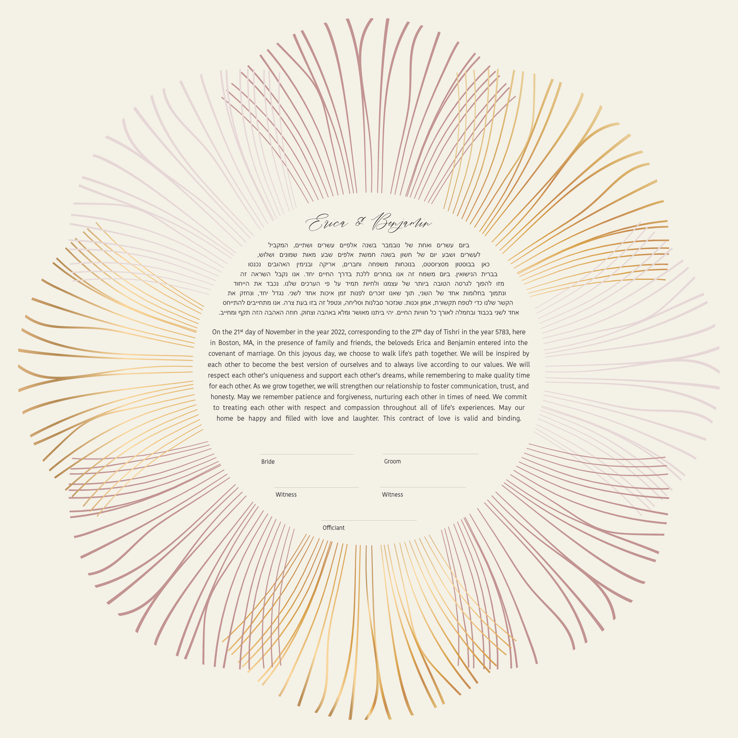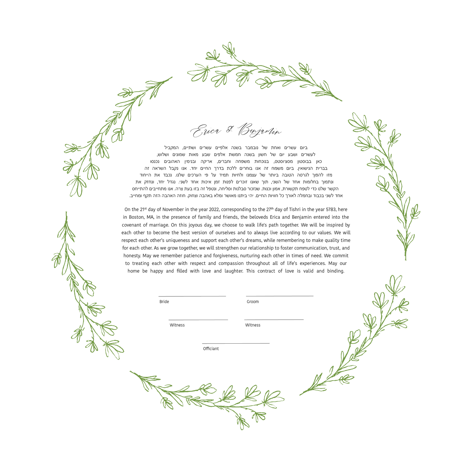 We'll email you a proof for your approval within 2 business days. We offer unlimited revisions to ensure that you love your Ketubah!