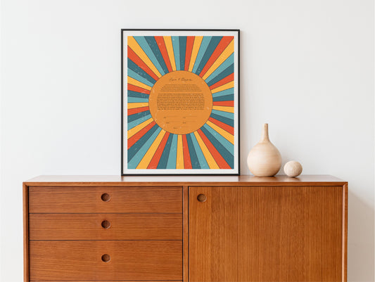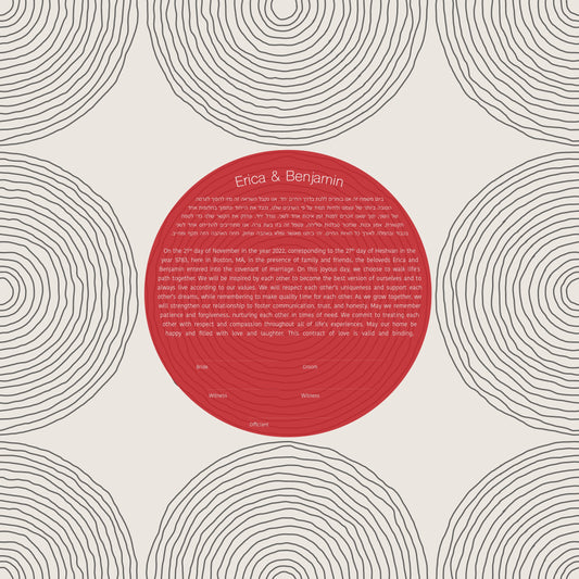 Our Midcentury Modern Ketubahs celebrate the timeless elegance of 1950s and 60s design—defined by geometric shapes, clean lines, and bold colors. Each piece reimagines the traditional Ketubah (also spelled Ketuba or Katuba) through the lens of modern art and architecture, blending heritage with innovation. Perfect for couples seeking a retro-inspired Ketubah with lasting sophistication and artistic flair.