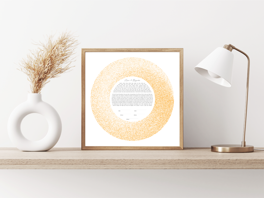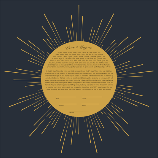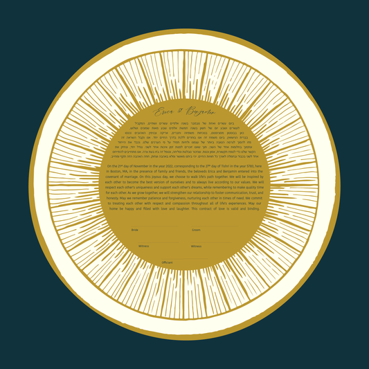 Every ketubah can be customized with our default text or your your fully custom text well suited to Orthodox, Reform, Interfaith, or Secular couples, ensuring your ketubah reflects your unique love story and wedding ceremony.