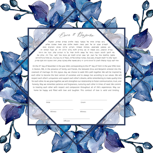 Every ketubah can be customized with our default text or your your fully custom text well suited to Orthodox, Reform, Interfaith, or Secular couples, ensuring your ketubah reflects your unique love story and wedding ceremony.