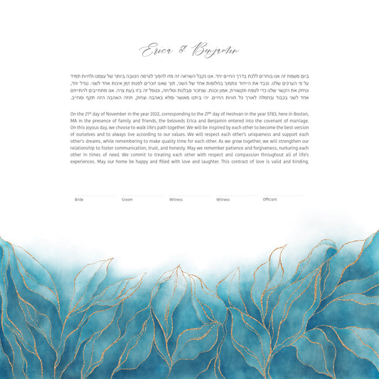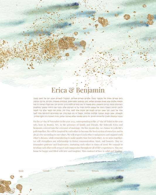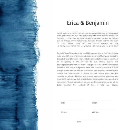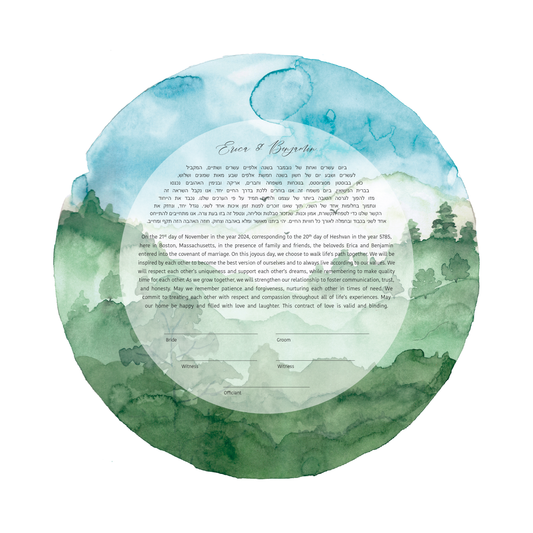 Our Watercolor Ketubahs bring your Jewish wedding contract to life with soft gradients, flowing pigments, and luminous color. Inspired by fine-art watercolor techniques, each design captures organic movement and artistic depth. Perfect for couples who love the look of hand-painted Ketubahs (also spelled Ketuba or Katuba), every piece feels unique—a modern expression of warmth, creativity, and timeless love.